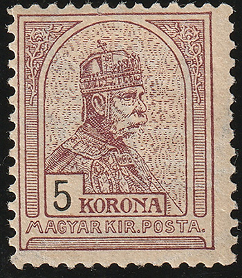A képen az 1904-es sor legnagyobb (5 koronás) értéke látható.
