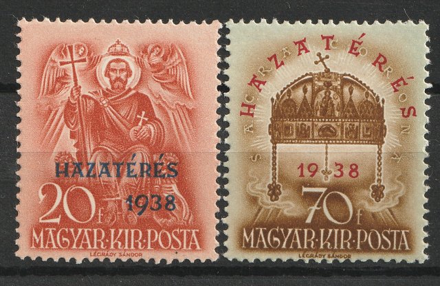 21938. november 2. napján az első bécsi döntés Csehszlovákiától 12.000 km2 Trianonban elcsatolt területet juttatott vissza Magyarországhoz 869 ezer fő lakossággal. Ennek alkalmából a posta alkalmi bélyegpárt adott ki. A kibocsátáshoz a Légrády Sándor által tervezett Szent István sorozat 20 és 70 filléres értékeit használták fel. A bélyegrajz azonos volt a korábbi sorozattal, azonban a 20 filléres esetében azonban a 20 filléresen a korábbi vörös színt barnásvörösre cserélték, a 70 filléres olajzöld nyomatát pedig a barna szín váltotta fel. Mindkét bélyegre felkerült a HAZATÉRÉS 1938 felirat. A 20 filléresből 4,4 millió darab, a 70 filléres címletből pedig 1,4 millió darab került forgalomba, így ezek a bélyegek sem számítanak ritkaságnak. |