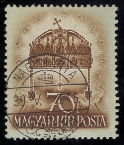 1A posta a hercegprímás javaslatára Szent István halálának 900. évfordulójára rendezett Szent István év alkalmából 14 címletből álló bélyegsorozatot bocsájtott ki, melyet Légrády Sándor tervezett. A sorozat első 13 címletén Szent István életének és uralkodásának nevezetesebb eseményei elevenednek meg. Az olajzöld színű 70 filléres címleten azonban a királyi korona látható jelenlegi formájában, amit dicsfény övez szélén kör alakban a SACRA CORONA felirat látható. A bélyegből több mint 3,3 millió darab került forgalomba, így hiába nagyon szép, de nem számít ritkaságnak. |